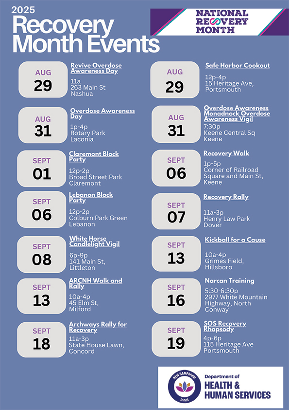 With the help of BDAS, we’ve compiled a full list of events happening throughout the state, available as a handy PDF download. No matter where you are in New Hampshire, there’s a Recovery Month event waiting for you to join in the celebration.